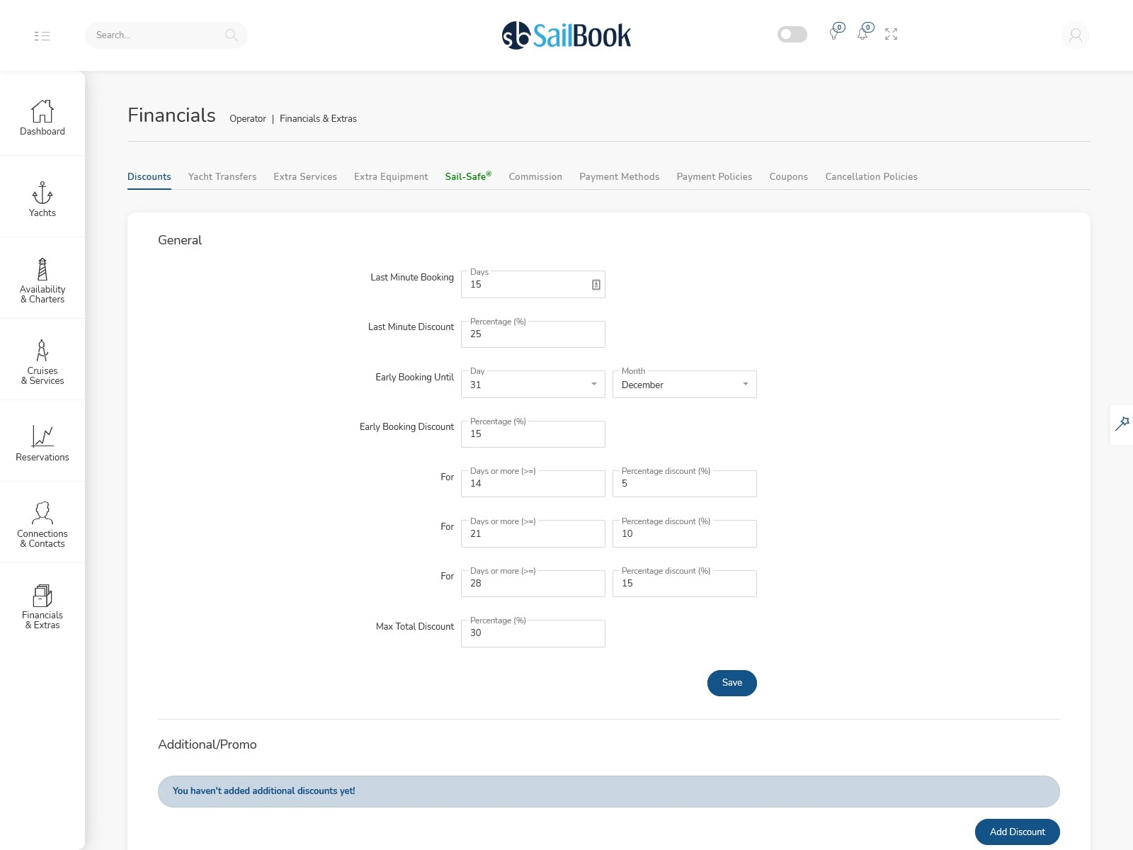 SailBook members have the possibility to promote their charter offers in many different ways. Discounts can be defined for the entire fleet - as for example early booking, repeat clients, long charter, last minute - or you can add special offers for specific dates and yachts.